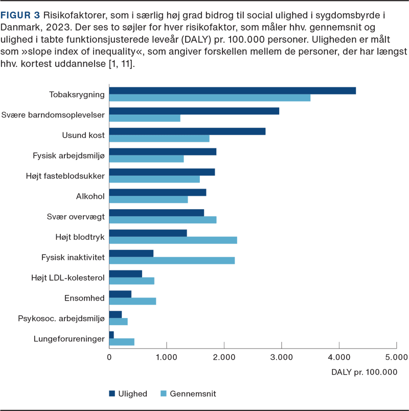 II: Afhængig af forældres eller egen sociale position som voksen er befolkningen i varierende grad eksponeret for sygdomsårsager i miljø og adfærd. Tobaksrygning, svære barndomsoplevelser, usund kost og fysisk arbejdsmiljø bidrager i særlig høj grad til ulighed i sygdomsbyrden (se Figur 3). Mange risikofaktorer hober sig i stigende grad op hos individer med kort uddannelse [1, 3].