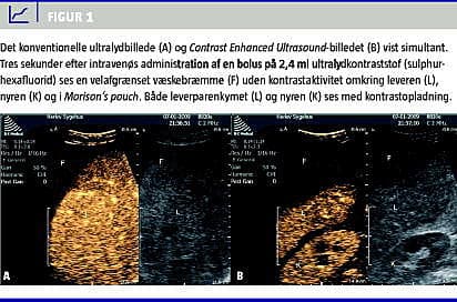 For at undersøge det nærmere blev der foretaget CEUS. I en i forvejen anlagt intravenøs adgang blev der givet en bolus på 2,4 ml ultralydkontraststof (sulphurhexafluorid) efterfulgt af 10 ml isotonisk saltvand. Det konventionelle UL-billedet blev vist simultant med CEUS-billedet på ultralydskannerens skærm. CEUS viste en velafgrænset bræmme uden kontrastaktivitet omkring leveren, i Morison's pouch og mellem tarmene (Figur 1 ).
