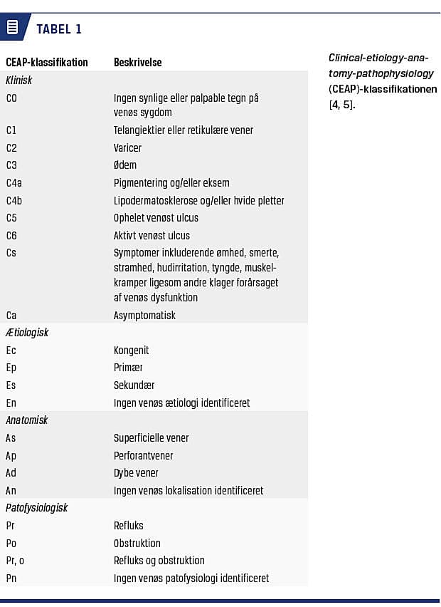 Kronisk venesygdom (KVS) i underekstremiteterne viser sig hyppigst i form af varicer, som er forårsaget af refluks i vena saphena magna, men kan også opstå pga. posttrombotiske forandringer i de dybe vener eller kompression af iliacavenerne [1-3]. Prævalensen af KVS er ca. 25% og stiger med alderen [1]. Til vurdering af KVS er clinical-etiology-anatomy-pathophysiology (CEAP) det mest anvendte klassifikationssystem