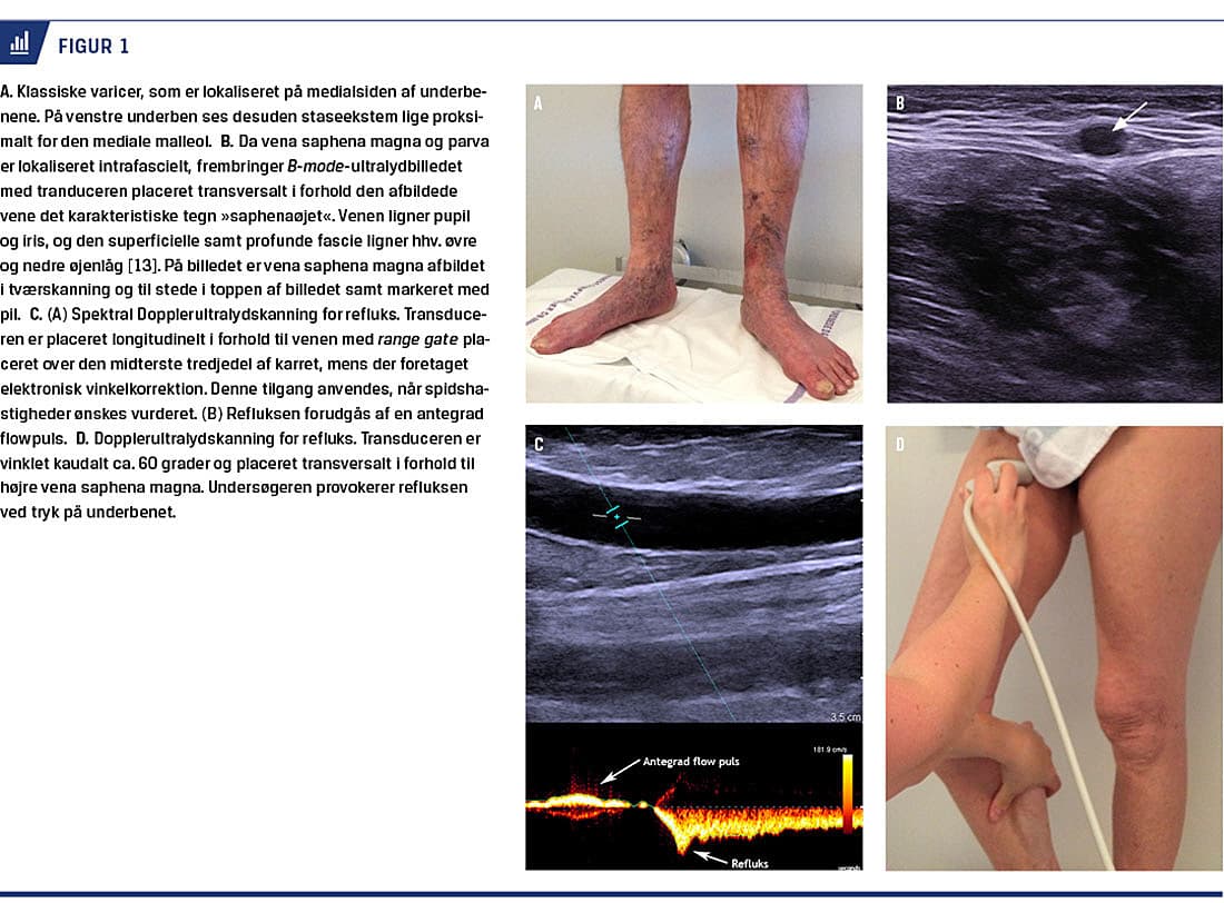 Varicer er subkutane, ofte slyngede vener, der måler mindst 3 mm i diameter målt mens patienten står op [4]. Venøse symptomer er bl.a. kramper, uro, træthed, tyngdefornemmelse, kløe og smerter, og ofte ses der forværring ved varme, ved stående stilling og sidst på dagen, men bedring ved ro og elevation [1, 6]. Objektive fund såsom ødem, pigmentering, eksem og sår ses ved sværere sygdom (Figur 1A) [1, 6]. Varicer er hyppigst lokaliseret medialt på crus og femur i relation til en insufficient vena saphena magna [5], men sjældnere ses der også varicer posteriort på crus som følge af klapinsufficiens i vena saphena parva [1]. Hos ca. 10% ses der varicer, som ikke har relation til saphenavenerne, men til f.eks. pudendus-, glutealis- eller ovaricavenerne [7]. Venøs claudicatio ses typisk ved iliofemoral udløbsobstruktion [8].