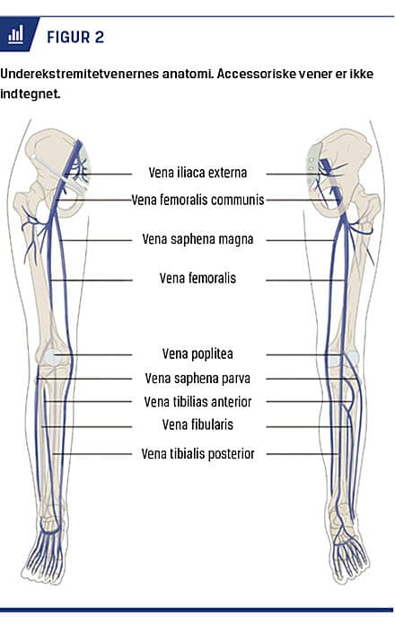 Vena saphena magna er lokaliseret medialt på låret og har ofte parallelt forløbende vener, hvor den hyppigste anteriore gren og den mindre hyppige posteriore gren kaldes henholdsvis den anteriore og den posteriore accessoriske vena saphena magna (Figur 2). På underbenet kaldes den posteriore accessoriske gren arkadevenen [12, 13]. Vena saphena parva er lokaliseret posteriort på underbenet og har hyppigt en kranial forlængelse på bagsiden af låret. Hvis parvas forlængelse har forbindelse med vena sapnena magna, betegnes den som vena Giacomini [12, 13]. Vena saphena magna og vena saphena parva henregnes til de overfladiske vener, selvom de forløber i deres egne fascieloger, hvilket giver anledning til ultralydtegnet »saphenaøjet« (Figur 1B). Perforantvenerne er talrige (flere hundreder) og forbinder de overfladiske vener med