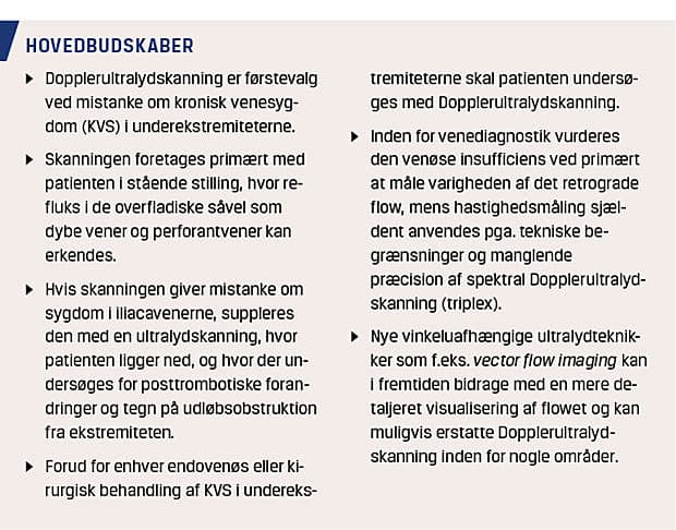 Duplex (B-mode- og farve-Dopplerultralyd)-skanning er i kombination med triplex (B-mode-, farve-Doppler- og spektral Dopplerultralyd)-skanning den kliniske standard til vurdering af venerne på underekstremiteterne [8, 17]. Ved undersøgelse for KVS skannes der med