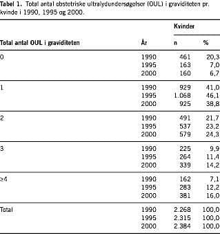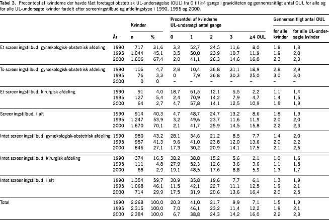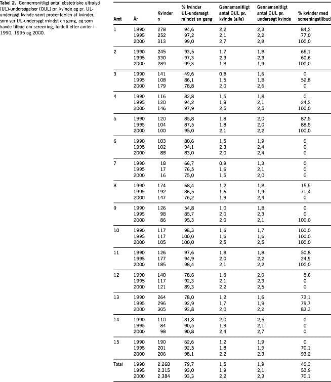Resultater: Kvinderne havde fået foretaget i alt 5.199 OUL, af hvilke 132 (2,5%) var foretaget i almen praksis eller i gynækologisk-obstetrisk speciallægepraksis, mens 5.067 (97,5%) var foretaget i hospitalsregi. 6,7% af kvinderne blev ikke UL-undersøgt i løbet af graviditeten mod 7,0% i 1995 og 20,3% i 1990. 38,8% blev undersøgt en gang. Det gennemsnitlige antal OUL i løbet af graviditeten var 2,2 for alle kvinder og 2,3 for alle UL-undersøgte kvinder. Det gennemsnitlige antal OUL pr. kvinde amterne imellem udviste en spændvidde på 1,5-2,7. Procentdelen af kvinder, der havde fået tilbud om UL-screening i de enkelte amter varierede fra nul til 100. I alt havde 70,1% af kvinderne i undersøgelsen fået tilbud om screening i 2000, mod 53,9% i 1995 og 40,3% i 1990.
