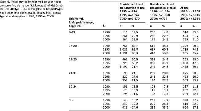 På trods af Sundhedsstyrelsens hidtil manglende rekommandation af UL-screening i graviditeten [13] har antallet af kvinder, der har fået screeningstilbud, været stigende i tiårsperioden [5]: 1990: 39,9%, 1995: 51,4% og 2000: 55,0%, dog fortsat med en betydelig regional variation (Tabel 2). Blandt de kvinder, som indgik i denne undersøgelse, havde 70,1% fået tilbud om screening, men screeningsprocenten faldt pr. 1. januar 2000, hvor tre gynækologisk-obstetriske afdelinger, der tidligere havde givet alle gravide på deres afdelinger et tilbud om UL-screening, ophørte hermed for at starte et medicinsk teknologivurderingsprojekt. Når tilbud om UL-screening gives, er der fortsat meget høj tilslutning hertil: 1990: 88,6%, 1995: 88,7% og 2000: 93,3%.