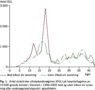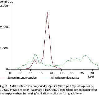 I Fig. 1 ses antallet af OUL i den sekundære sundhedssektor for kvinder med og uden tilbud om screening, vægtet pr. 10.000 kvinder og afbildet efter undersøgelsestidspunkt. I begge grupper ses undersøgelsesantallet at toppe i henholdsvis 16-19 og 35-38 fulde uger.
