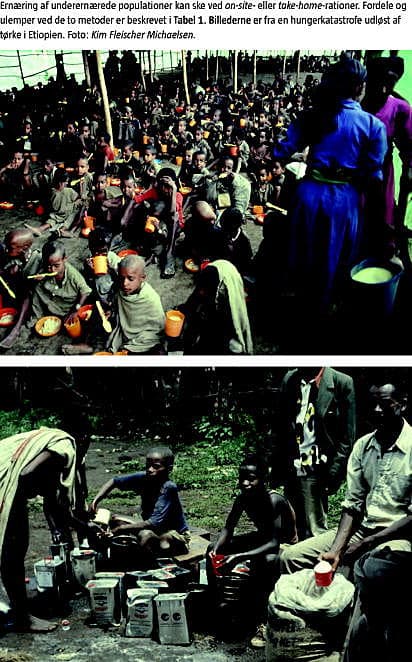 I de nævnte programmer kan maden både blive tilberedt på stedet (on-site) eller udleveret som take-home -rationer. FN-organisationerne anbefaler, at take-home -rationer overvejes først, bl.a. fordi omkostningerne er lavere (Tabel 1 ). Det er oftest personer med lokal autoritet, der står for uddelingen [5], men pga. f.eks. korruption og videresalg er der risiko for, at maden ikke når dem, der har behov.