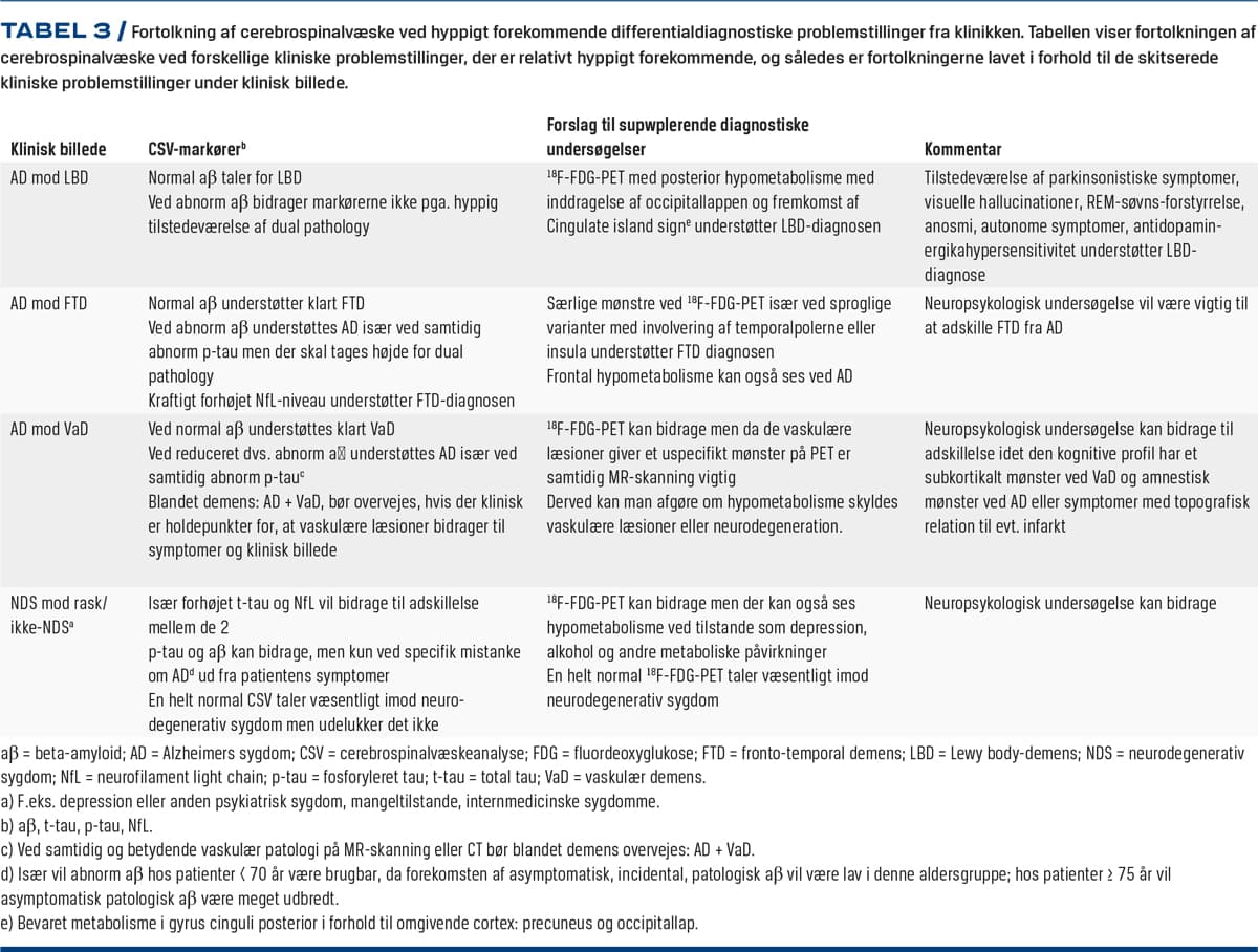 Tolkning af niveauerne af aβ og p-tau skal altid ske i den rette kliniske kontekst. Patologiske aflejringer af aβ forekommer med stigende prævalens med alderen hos kognitivt raske ældre med en forekomst hos +75-årige på over 20% [17]. Ligeledes fandtes der hos patienter med sprogvarianter af frontotemporal demens (FTD), der anses for en tauopati, en næsten parallel aldersrelateret prævalens af aβ [18]. Således behøver patologisk aβ i CSV ikke at være relateret til evt. kognitive symptomer, men kan i stedet skyldes anden patologi. Som tidligere nævnt argumenterer visse forskere for, at AD bør tolkes som en proteinopati, dvs. at tilstedeværelse eller fravær af abnorme proteinaflejringer er den eneste faktor, der er betydende ift. at stille diagnosen (aβ er en nødvendig og tilstrækkelig faktor for at stille AD-diagnosen) [9]. En anden tolkning er, at aβ er en risikofaktor for udvikling af kognitive symptomer og demens (aβ er en nødvendig, men ikke tilstrækkelig faktor for at stille AD-diagnosen), da patienter med patologisk aβ-koncentration, men ingen symptomer, kan blive meget gamle uden at udvikle symptomer på AD [19]. Især ved meget milde symptomer og ved yngre patienter er det relevant at betone denne usikkerhed, og grundig biomarkørrådgivning af patienter bør udføres. Dog falder forekomsten af patologisk aβ-koncentration drastisk hos personer, der er under 70 år og ikke har kognitive symptomer, hvorfor denne biomarkør må antages at have større værdi i yngre aldersgrupper. I klinisk praksis er det mest oplagt at tolke biomarkørerne i forhold til symptomer og kliniske fund hos den enkelte patient, da dette vil være mest brugbart for patienten og relevant for de fleste patienter, der ses i demensudredningsklinikker. Et andet aspekt er, at ved f.eks. Lewy body-demens (LBD) er såkaldt dual pathology, dvs. aflejring af både aβ og α-synuklein hyppigt forekommende. LBD og AD kan klinisk være vanskelig at skelne fra hinanden, og i visse tilfælde bidrager begge patologier formentligt til symptombilledet. Ved differentialdiagnostiske overvejelser mellem AD og FTD vil normal aβ-koncentration med stor sandsynlighed udelukke AD. I det hele taget bør normal aβ-koncentration i CSV tages som et relativt sikkert tegn på, at patienten ikke har AD, hvorimod patologisk forekomst bør tolkes ud fra ovenstående betragtninger om patofysiologi etc. (Tabel 2 og Tabel 3). Det er dog vigtigt at understrege, at der i klinikken med jævne mellemrum ses AD-»fænokopier« med normal aβ-koncentration. Disse kan repræsentere såkaldt limbic-predominant age-related transactive response DNA binding protein of 43kDa (TDP-43) encephalopathy, dvs. en TDP-43-proteinopati, der kan have en amnestisk præsentation meget lig AD [20], eller det kan dreje sig om andre patologier, der rammer dele af hukommelsesnetværket, såkaldt suspected non-Alzheimer pathology [21].