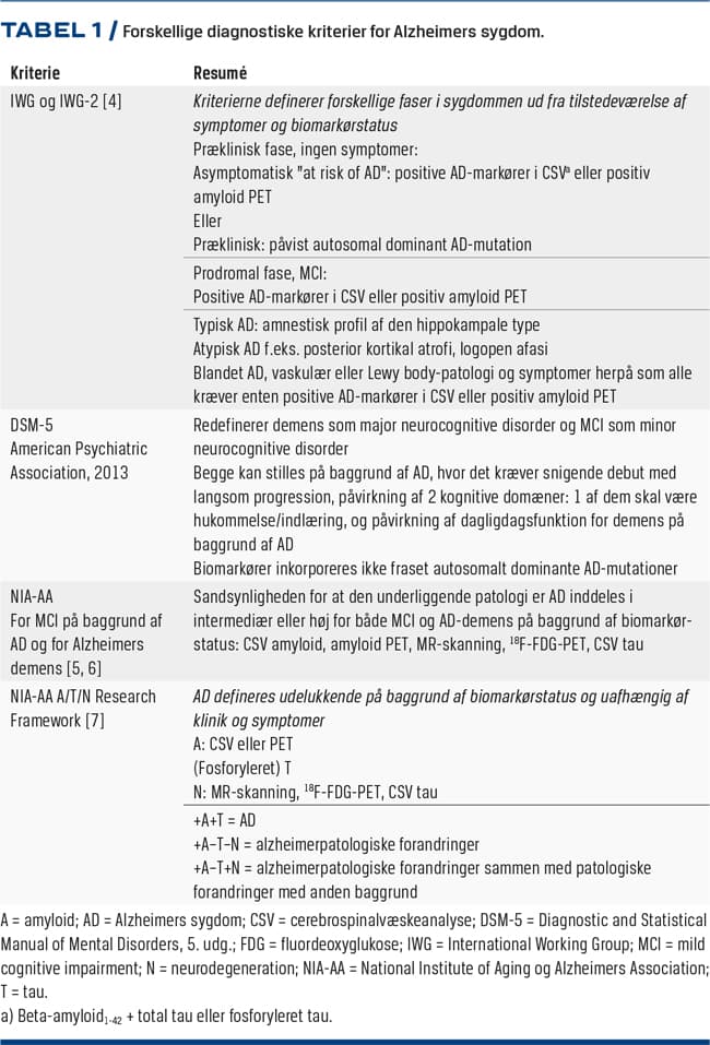 I modsætning til aβ- og p-tau-koncentrationerne, som er relativt specifikke for Alzheimers sygdom (AD), er t-tau- og NfL-koncentrationen uspecifikke markører for neurodegeneration og ses også at være forhøjet ved andre tilstande såsom multipel sklerose (MS) og cerebrovaskulær sygdom [4]. AD forstås i tiltagende grad som en klinisk-biologisk sygdomsenhed, hvor den underliggende patofysiologi tager udgangspunkt i amyloidkaskadehypotesen. Dvs. hvor kortikale aflejringer af aβ sker som en tidlig og nødvendig begivenhed i patofysiologien (op til 30 år før symptomerne) og senere følges af tauaflejringer, hjerneatrofi og symptomer [5]. Dette afspejler sig også i de sidste nye forskningsdiagnosekriterier for AD, hvor biomarkører (aβ og tau i CSV) indgår som en central del af de diagnostiske kriterier [6-8]. Efterfølgende er der publiceret et såkaldt A(myloid)/T(au)/N(eurodegeneration) research framework, hvor AD alene (og aldeles afkoblet fra klinikken) defineres som en proteinopati [9] (Tabel 1). Dette er tænkt anvendt inden for forskning og ikke i klinikken. Selvom amyloidkaskadehypotesen er blevet underbygget af talrige observationer, er der bred enighed om, at den ikke er endegyldigt bevist, og især de senere års negative resultater fra lægemiddelafprøvningsforsøg med antistoffer rettet mod aβ har rejst fornyet tvivl om hypotesen [10].