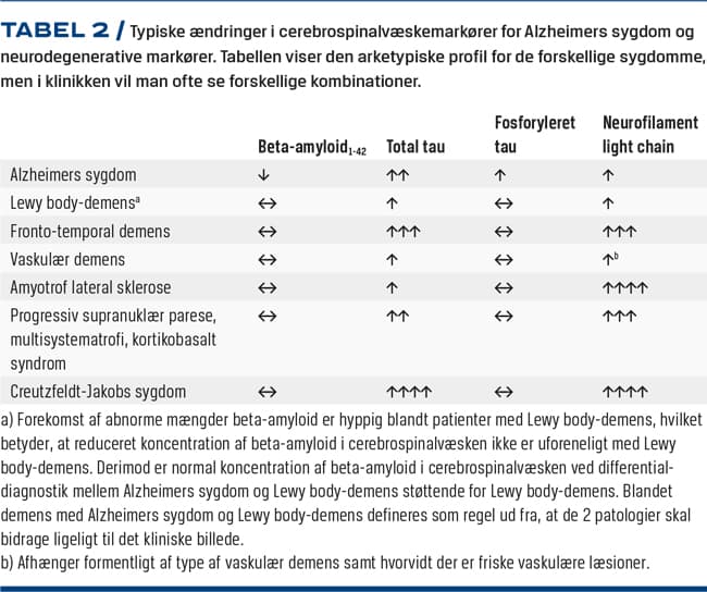 Hvor man vha. koncentrationerne af aβ og p-tau kan påvise specifikke begivenheder i den formodede patofysiologiske kaskade ved AD, afspejler t-tau- og NfL-koncentrationen nedstrøms begivenheder, der i et vist omfang deles på tværs af sygdomme, dvs. den resulterende neurodegeneration. Derved bliver ændringerne mindre brugbare til differentialdiagnostik. Dog ses der oftest en væsentligt højere koncentration af NfL ved FTD end ved AD [22], og ligeledes ses NfL-niveauet også at være markant forhøjet ved atypisk Parkinsons sygdom [23]. Ved motorneuron sygdom kan NfL-niveauet være endog meget højt (f.eks. > 10.000 ng/l) [24]. ALS sammen med FTD ses i øvrigt hyppigt samtidigt hos patienter. NfL-niveauet i CSV er formentligt også forhøjet i det akutte forløb efter apopleksi. I blodet er NfL-niveauet forhøjet indtil tre måneder efter apopleksi [25] og korrelerer med småkarssygdom [26], og i samme periode kan der se fald i aβ-koncentrationen i CSV til under referenceniveauet. Ved hastigt progredierende demens og svært forhøjet t-tau-niveau bør man have mistanke om Creutzfeldt-Jakobs sygdom, men et svært forhøjet t-tau-niveau er dog langt hyppigere ved AD [27] (Tabel 2 og Tabel 3).