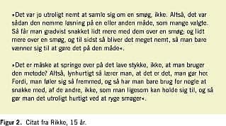 Pigerne havde forskellige grunde til at tage på efterskole. Uanset begrundelserne var det afgørende at skabe sig adgang til og deltage i det fællesskab, som ved skoleårets begyndelse hurtigt skabtes. Nye venskaber er en forudsætning for at opholdet opleves som en succes; de omtales som venskaber for livet. I forbindelse med etableringen af disse venskaber var rygning en klar strategi, Figur 2 .