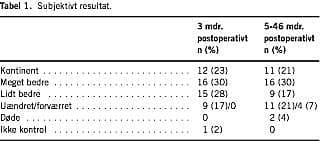 Ved den kliniske kontrol 3 mdr. efter injektionen var 12 (23%) kontinente, og 31 (58%) angav bedret kontinens (Tabel 1 ). Femten kvinder (28%) fik foretaget re-injektion efter 4-11 mdr.