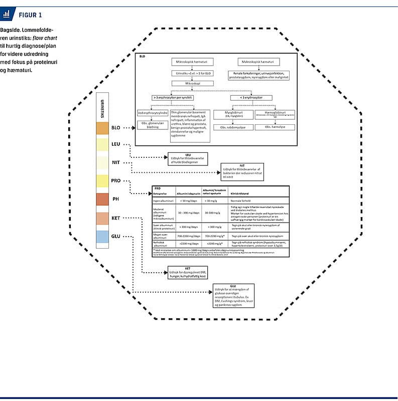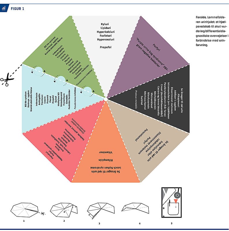 Vi har nu 526 år senere forsøgt at skabe et simpelt diagnostisk redskab til tolkning af de forskellige urinfarver. Det er et moderniseret, de Ketham-inspireret urinhjul designet som en lommefolder. Den nye version består udelukkende af otte farver, og der tages ikke hensyn til de fire temperamenter. Til gengæld fokuserer vi på de i vores tid mere relevante og alvorlige årsager og den tilhørende udredning (Figur 1).