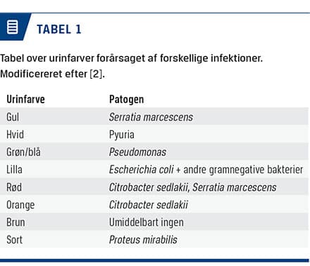 Forskellige bakterier kan fremkalde forskellige urinfarvninger. En urindyrkning vil hurtig afklare, om en urinvejsinfektion er årsag til misfarvningen. Vi har sammenfattet forskellige patogener i Tabel 1. I respekt for urinanalysens lange tradition har vi forsøgt at etablere en nyere, måske for vores tid mere relevant, version af urinhjulet (Figur 1). Vi håber, at den lille lommefolder vil kunne tjene som hurtig reference til urinanalyse.