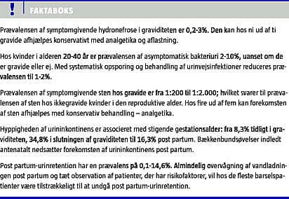 Gravide har en øget hyppighed af urininkontinens (UI), der ændres fra en prævalens på 8,3% tidligt i graviditeten og 34,8% i slutningen af graviditeten til 16,3% post partum [17]. Hovedsymptomet er stress-UI; hovedparten af disse tilfælde er tilkommet under graviditeten, såkaldt de novo-stress-UI. I modsætning hertil ses urge-UI mere sporadisk og begynder sjældent under en graviditet. Hovedårsagen til de novo-stress-UI under en graviditet er formentlig strækskader i bindevævet [17, 18]. Andre faktorer (bl.a. overvægt og rygning) spiller dog også en vis rolle. Diagnosen UI under en graviditet stilles på grundlag af patientens anamnestiske oplysninger. Urodynamik er en tidskrævende invasiv undersøgelse, og resultatet heraf korrelerer dårligt med de anamnestiske oplysninger under en graviditet. De novo-UI under graviditeten og vaginal fødsel udgør vigtige risikofaktorer for UI post partum [17, 19, 20]. Forekomsten af UI post partum er betydeligt reduceret allerede tre måneder post partum [21]. Forekomst af UI post partum og til dels under graviditeten er i øvrigt et godt prognostikum for, om kvinden senere i livet får UI [21].