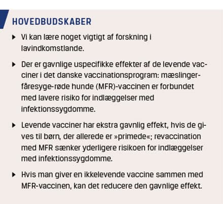 Studies from low-income countries show, that vaccines may have effects on overall mortality, so-called non-specific effects, which cannot be explained by the effect on the targeted infection. We investigated if vaccines have non-specific effects on infectious disease morbidity in Denmark, and we found beneficial non-specific effects of measles-mumps-rubella vaccine, which have now been confirmed in other high-income settings. Danish investment in research in low-income countries may lead to important new insights with consequences not only for the recipient country but also for Denmark.