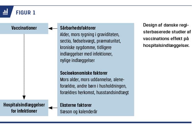 Vi har derfor benyttet de danske registre (Figur 1) til at studere nogle af de overordnede hypoteser, som er udviklet i Guinea-Bissau: 1) Levende vacciner har gavnlige uspecifikke effekter på hospitalsindlæggelser, 2) en levende vaccine givet sammen med en ikkelevende vaccine er forbundet med mindre gavnlige effekter end en levende vaccine givet alene, og 3) de gavnlige uspecifikke effekter af levende vacciner forstærkes hos børn, der allerede har immunitet mod antigenet.