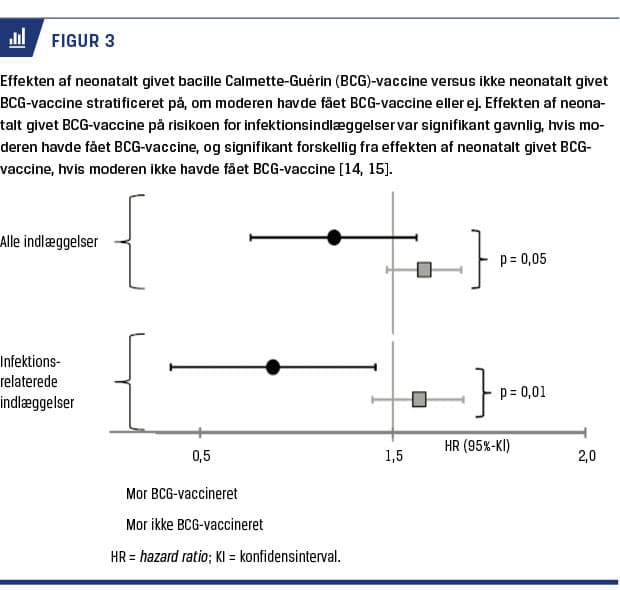 I Guinea-Bissau havde vi fundet, at MV var forbundet med særlig lav dødelighed, når den blev givet til børn, der havde maternelle mæslingeantistoffer [4]. Derfor besluttede vi i Calmettestudiet at indsamle information om mødrenes BCG-status. I Danmark ophørte vi med BCG-vaccination af skolebørn i de tidlige 1980’ere, og 17% af mødrene i Calmettestudiet havde tidligere fået en BCG-vaccine, mens 83% ikke havde fået en BCG-vaccine. Baseret på fundene i Guinea-Bissau forestillede vi os, at BCG-vaccinen var mere gavnlig blandt børn af mødre, der selv havde fået vaccinen. Og sådan forholdt det sig: Blandt børn af BCG-vaccinerede mødre var det at få BCG-vaccinen versus det ikke at få den forbundet med 35% (95% KI: 6-55%) lavere risiko for infektionsrelaterede indlæggelser [15, 16] (Figur 3). Vi har efterfølgende påvist i Guinea-Bissau, at den gavnlige effekt af barnets BCG-vaccination er stærkere, hvis moderen har et BCG-vaccinationsar, som tegn på tidligere BCG-vaccination.