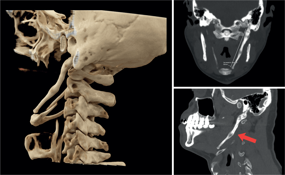 En 54-årig mand blev henvist med tre års intermitterende smerter, dysfagi og muskelspændinger lokaliseret til venstre kæbevinkel og strube. Smerterne forværredes eller opstod ved gab eller grin, og patienten kunne opleve en knasen ved hovedbevægelser. Han havde prøvet talepædagog og kraniosakralterapi uden effekt. Ved en otologisk undersøgelse var det eneste abnorme fund en palpatorisk markant processus styloideus i venstre side intraoralt.