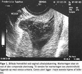 På grund af vedvarende blæretømningsbesvær blev patienten vaginalskannet efter tre uger. Man fandt da en 2 cm defekt i forreste del af isthmus med udbugning af uterinindhold ind mod blæren (Figur 1 ).