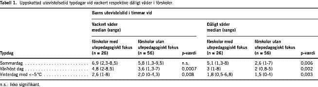 Barnens uppskattade utevistelsetid varierade med årstid (Tabell 1 ). Förskolor med utomhuspedagogisk inriktning (n=26) hade längre utevistelsetider än de övriga förskolorna (n=56) utom vid sommardagar med vackert väder (Tabell 1). Under dagar med varm väderlek (se fotnot Tabell 2 ) var barnen på förskolor med utomhuspedagogisk inriktning utomhus längre än förskolor utan sådan inriktning; 5,54 jämfört med fyra timmar; p=0,001 respektive.
