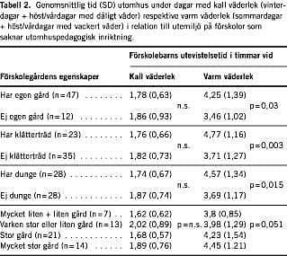 Resultat: Förskolor med utomhuspedagogisk inriktning hade en mer lekvänlig miljö. Barnen i dessa förskolor var utomhus längre tid under alla säsonger utom vid vackert väder sommartid jämfört med förskolor utan denna inriktning. Barn i förskolor utan utomhuspedagogisk inriktning men som hade egen gård med klätterträd eller dunge var utomhus längre tid vid varm väderlek än barn som saknade en sådan gård.