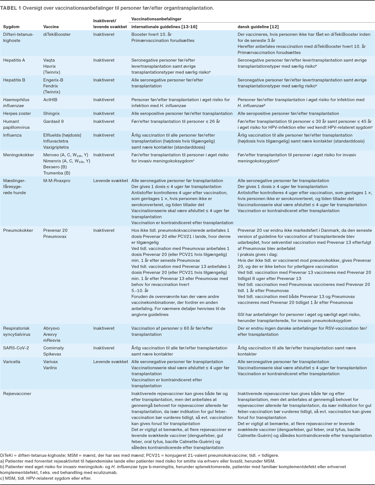 Tabel 1 viser en oversigt over danske og internationale anbefalinger for vaccination før og efter organtransplantation [12-16]. Disse anbefalinger baserer sig i høj grad på studier i den generelle befolkning eller andre risikogrupper grundet manglende evidens for vaccination af organtransplanterede. Desuden bør organtransplanterede følge populationsanbefalinger for vaccination i tilfælde af epidemier, hvor der typisk vil komme anbefalinger specifikt til immunsupprimerede populationer.