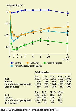 Dansk Selskab for Adipositas Forskning (DSAF) er begejstret for, at man i Swedish Obese Subjects Study (SOS) har påvist mortalitetsreduktion efter kirurgisk fedmebehandling [1]. Fra 1987 til 2001 blev der inkluderet 4.057 adipøse, primært nondiabetiske patienter på 37-60 år med et body mass index (BMI) > 34 kg/m2 for mænd og > 38 kg/m2 for kvinder. Et bevaret vægttab på 20-30% medførte efter 11 år en reduktion i dødeligheden på 30% (Figur 1 ). Dette skyldes en halvering af myokardieinfarkter og cancerdødsfald. Omvendt fandtes en tendens til øget risiko for slagtilfælde i forhold til kontrolgruppen, der blev behandlet diætetisk med en gennemsnitlig vægtøgning på 2 kg til følge.