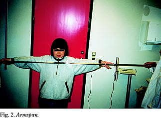 Grønlandske drenges slutlængde for armspænd synes at ligge ca. 5 cm over deres stående sluthøjde og synes først at nås et år senere (Tabel 1). For danske drenge kan dette forhold ikke bedømmes, idet der ikke er blevet publiceret et dansk materiale, hvor begge kropsmål er registreret. Hos grønlandske piger fandt vi ikke nogen væsentlig forskel på stående højde og armspænd.