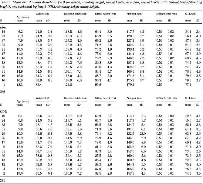 Material and methods: We recorded the weight, standing height, sitting height, armspan, and menarcheal age. After the exclusion of 52 children with at least one parent not of Greenlandic origin and the exclusion of ten children who were either suffering from conditions known to influence growth or in whom some of the anthropometric data were lacking, 266 boys and 271 girls remai ned in the study. The 537 children were between 5 and 19 years old.