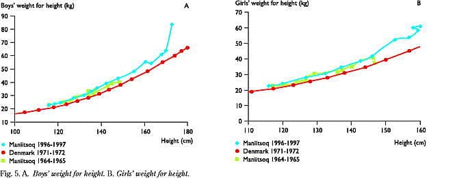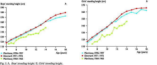 I 14-års-alderen fandtes 3 cm lavere højde for grønlandske drenge og 5 cm lavere højde for piger. Ved en given højde var grønlandske børn 0,2-5 kg tungere end skandinaviske børn.