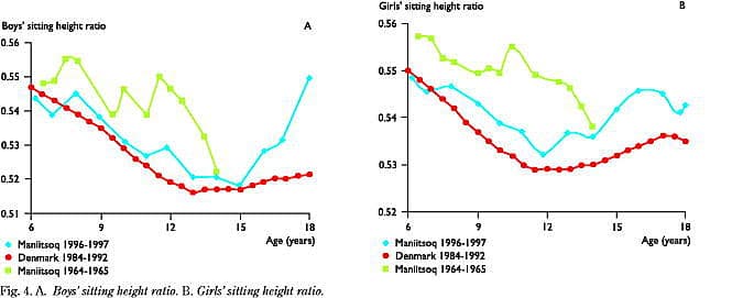 Fra puberteten synes den grønlandske højdevækstkurve for begge køn at flade ud, således at stående voksenhøjde er 5-7 cm mindre end i Danmark. Voksen siddehøjde er næsten på dansk niveau. Indtil puberteten synes grønlandske børn at følge de danske vækstkurver for stående højde. Herefter planer de ud. Det betyder, at voksen siddehøjderatio er større hos grønlændere end hos danskere.