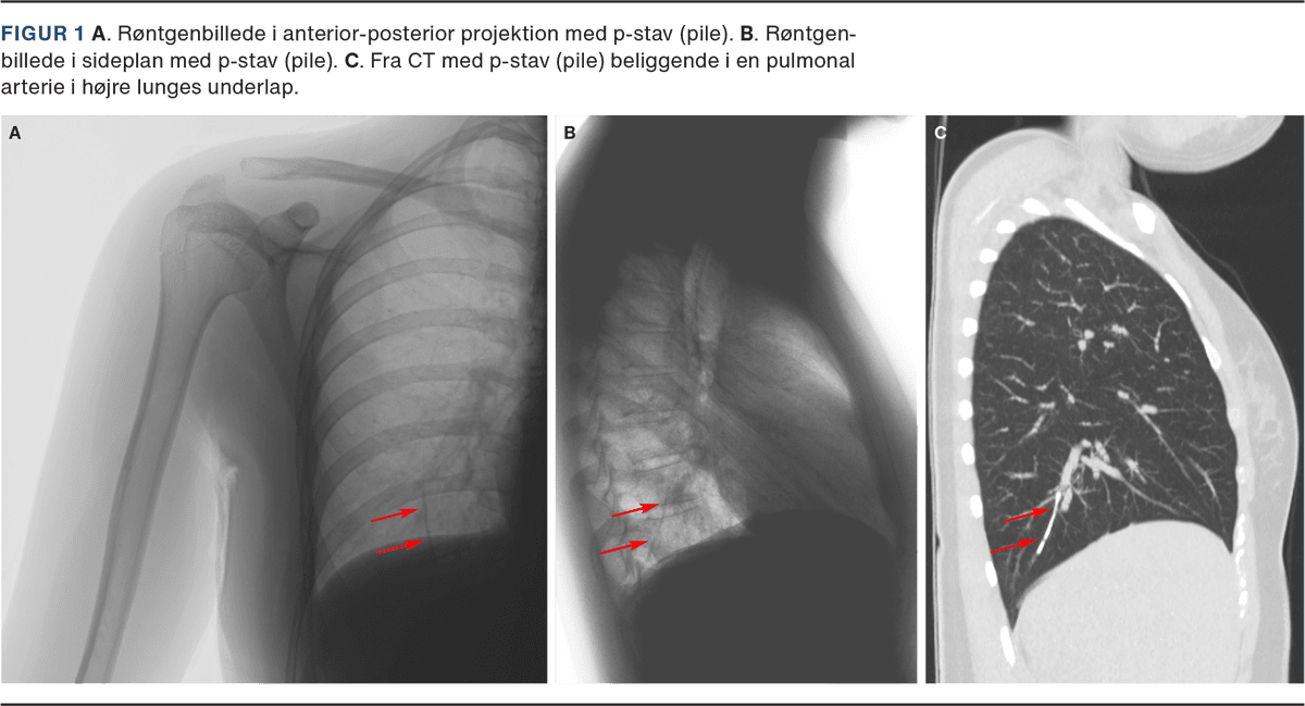 På regionssygehuset var røntgenundersøgelser og UL-skanning de eneste billeddiagnostiske muligheder, og patienten blev henvist til Dronning Ingrids Hospital i Nuuk, hvor p-stavens beliggenhed i en mindre pulmonal arterie i højre lunges underlap blev bekræftet med CT (Figur 1C). Der var ingen tegn på blødning eller lokale reaktive forandringer.