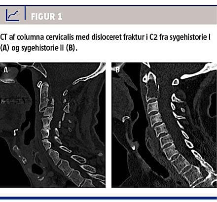 Han blev henvist direkte fra Radiologisk Afdeling til Skadestuen forudgået af kontakt til ortopædkirurgisk bagvagt med påvist disloceret densfraktur i C2 (Figur 1A). Objektivt fandtes der ingen neurologiske udfald. Han fik anlagt stiv halskrave, perifert venekateter og blev via rygvagten på Aarhus Universitetshospital overflyttet akut til udførelse af bagre spondylodese af columna cervicalis.