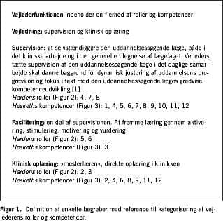 Ifølge Sundhedsstyrelsen vejledning omfatter vejlederfunktionen klinisk undervisning (mesterlære) og supervision (Figur 1 ). Ved klinisk undervisning forstås her den direkte kliniske oplæring. Ved supervision forstås vejlederens arbejde med »at selvstændiggøre den uddannelsessøgende læge, både i det kliniske arbejde og i den generelle tilegnelse af lægefaget. Vejlederens tætte supervision af den uddannelsessøgende læge i det daglige samarbejde skal danne baggrund for dynamisk justering af uddannelsens progression og fokus i takt med den uddannelsessøgende læges gradvise kompetenceudvikling« [1].