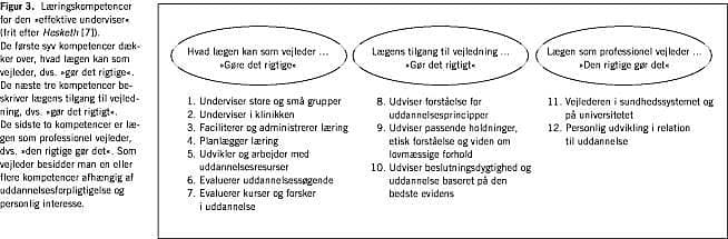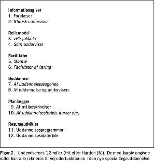 Vejlederfunktionen i den nye speciallægeuddannelse kan beskrives som omfattende flere roller og kompetencer. Harden [6] har identificeret 12 roller for undervisere i medicinsk uddannelse (Figur 2 ) mens Hesketh [7] beskriver 12 kompetencer for den effektive underviser (Figur 3 ). En kategorisering af vejlederens roller og kompetencer tjener flere formål. Den kan anskueliggøre de forskellige og nogle gange modsatrettede roller, der ligger i vejlederfunktionen. Eksempelvis formidler man viden og færdigheder ved klinisk oplæring, mens man som facilitator hjælper den uddannelsessøgende med at finde muligheder i den kliniske sammenhæng, observerer og giver feedback. Som rollemodel udviser man entusiasme for specialet, gode kliniske overvejelser, god patient-læge-kontakt og ser patienten som et hele. Samtidig kan man som bedømmer skulle vurdere, om den uddannelsessøgende opnår de forventede kompetencer. Kategoriseringen giver mulighed for at afdække såvel den enkelte vejleders kompetencer som en afdelings samlede uddannelsesresurser og kan danne grundlag for uddannelsesplanlægning af vejledere. Når den nye speciallægeuddannelse implementeres, vil det være nødvendigt både på den enkelte afdeling og inden for specialerne at diskutere, hvorledes disse roller og kompetencer skal håndteres.