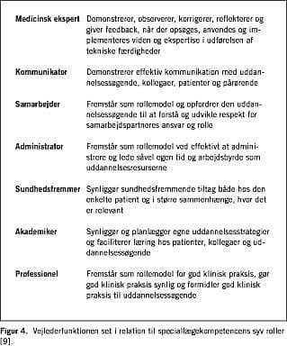 De principper, der er skitseret for vejledning i den nye speciallægeuddannelse, er i overensstemmelse med, hvad der beskrives i litteraturen. Den effektive vejleder er klinisk kompetent, skal kunne indgå i direkte oplæring i klinikken og her være rollemodel [3, 7, 8]. Prideauax [9] beskriver, hvordan speciallægekompetencens syv roller kan indgå i god klinisk vejledning (Figur 4 ). Vejlederen skal også supervisere. Udbyttet af supervision øges, når vejlederen bidrager med kobling af teori og praksis, indgår i processen ved klinisk problemløsning, rådgiver og giver feedback [3]. Vejlederen kan facilitere læring ved at hjælpe den uddannelsessøgende til at sætte mål for egen læring, til at vurdere praksis, til at uddybe og reflektere over egen praksis og herved facilitere dybere forståelse. Som facilitator kan vejlederen desuden udfordre den uddannelsessøgende, stille spørgsmål, komme med flere muligheder samt korrigere fejl og misforståelser [3-8].