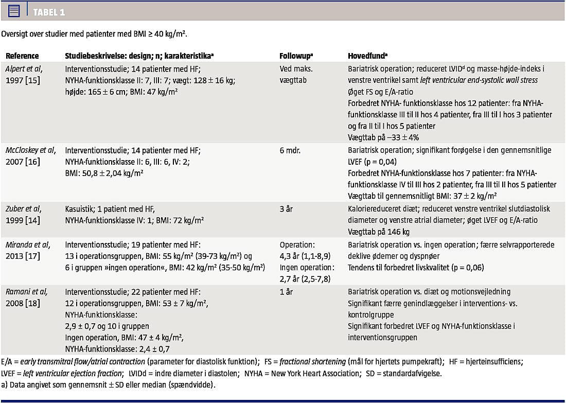 Fem små interventionsstudier, der viste, at vægttab hos patienter med HF og BMI > 40 kg/m2 havde gunstig effekt på hjertefunktionen [14-18]. De væsentligste begrænsninger i studierne var, at man havde inkluderet et lille antal patienter, og at man i tre af studi-