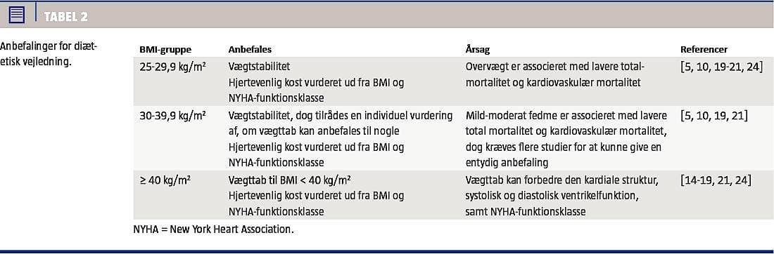 Der mangler specielt evidens for de mildt-moderat fede patienter med HF, og det kræver flere prospektive studier, eventuelt med differentiering mellem NYHA-funktionsklasserne for at kunne give en mere entydig anbefaling. De divergerende rekommandationer i guidelines vidner ligeledes om manglende evidens på området. I Tabel 2 gives et resume af diskussionen.