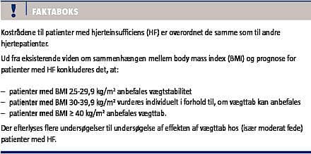I den senest publicerede metaanalyse, hvor man har undersøgt effekten af overvægt og fedme (BMI > 25 kg/m2) på mortaliteten hos patienter med HF, inkluderedes 28.209 patienter fra ni observationelle studier [5]. Analysen viste, at både overvægt og fedme var associeret med lavere risiko for totalmortalitet, henholdsvis relativ risiko (RR) 0,84 (95% konfidens-interval (KI): 0,79-0,90) og RR 0,67 (95% KI: 0,62-0,73) end normalvægt. Overvægt og fedme var desuden associeret med lavere risiko for kardiovaskulær mortalitet, henholdsvis RR 0,81 (95% KI: 0,72-0,92) og RR 0,60 (95% KI: 0,53-0,69) end normalvægt. Analysen viste også, at BMI > 35 kg/m2 var associeret med lavere risiko for totalmortalitet, RR 0,62 (95% KI: 0,55-0,69) end BMI < 25 kg/m2 [5].