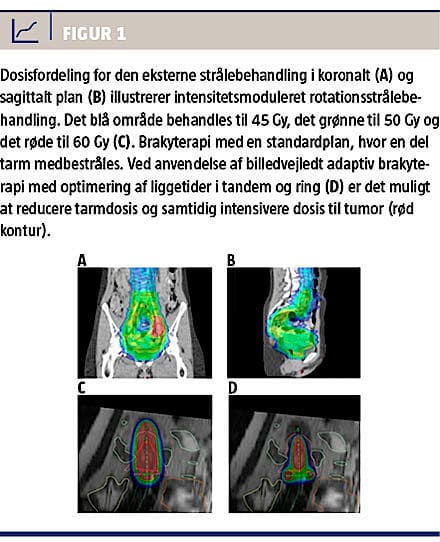 Den eksterne strålebehandling blev givet med VMAT, der giver mulighed for at behandle relativt store volumina og samtidig reducere dosis til raske organer. VMAT har yderligere den fordel, at dosis til patologiske lymfeknuder kan øges vha. simultanintegreret boost. Dermed reduceres omfanget af akutte bivirkninger og risikoen for sene bivirkninger, der typisk opstår måneder til år efter endt behandling [1]. Hos patienten i sygehistorien blev lokalkontrol af cervix sikret ved hjælp af MR-skanningsvejledt adaptiv brakyterapi, der i monoinstitutionelle studier har vist sig at være traditionel røntgenvejledt brakyterapi overlegen mht. både overlevelse (5-10% forbedring) og morbiditet hos patienter med cervixcancer [2, 3].