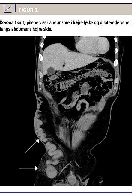 Objektivt fandt man fra højre lyske en stor subkutan udfyldning, der strakte sig 10 cm lateralt og kranialt og gav ømhed ved palpation (Figur 1). En biokemisk undersøgelse viste en normal laktatkoncentration og forhøjet D-dimerkoncentration på 0,45 mg/l, men ellers normale forhold. Patienten fik foretaget akut computertomografi (CT) af abdomen, hvor man beskrev dilateret vene i højre fossa og mistanke om trombe i venen eller inkarcereret lyskebrok. Unersøgelsen blev primært tolket radiologisk som et lyskebrok på 5 × 3 cm, og der var mistanke om strangulation (Figur 1). Kirurgisk blev det efterfølgende vurderet, at der ikke var sammenhæng mellem anamnesen, de objektive fund og tolkningen af CT’en. Karkirurgerne vurderede efter konference, at patienten havde VCA infrarenalt og ikke hernie. Patienten fik foretaget en ultralydskanning, som viste DVT i et aneurisme i højre lyske, hvilket også efterfølgende kunne ses på CT. Patienten blev sat i relevant antikoagulansbehandling. Trods dette fik han et døgn senere trykken i brystet ved dyb inspiration, men uden dyspnø. En elektrokardiografi gav mistanke om lateralt inferiort infarkt, og troponinkoncentrationen steg fra 2,83 til 5,50 mikrogram/l. D-dimerkoncentrationen faldt til 0,17 mg/l. Mistanke om akut myokardieinfarkt og lungeemboli udløste en spiral-CT, ekkokardiografi og koronarangiografi, som viste normale forhold. Ifølge den kardiologiske bagvagt var der tale om ST-segmentelevationsmyokardieinfarkt på baggrund af paradoks emboli fra DVT i lysken. Ved udskrivelsen blev der anbefalet opfølgende transøsofageal ekkokardiografi på grund af mistanke om persisterende foramen ovale eller speciel venøs anatomi. Patienten rejste imidlertid til Sverige, og yderligere information om det videre forløb foreligger ikke.
