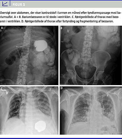 Der blev lavet en oversigt over abdomen, hvor man så en bariumbezoar i ventriklen. Denne havde været til stede, siden der blev foretaget tyndtarmspassage (Figur 1 ). Der blev lavet en gastroskopi, hvor bezoaren ved hjælp af vand og sodavand blev fragmenteret, fortyndet og aspireret. Herefter ophørte patientens gastrointestinale symptomer. Han blev udskrevet i velbefindende to måneder efter det første kirurgiske indgreb.