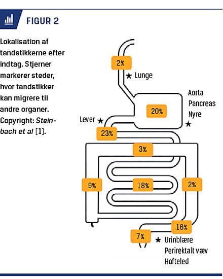 kasuistikker siden 1980, og tilstanden er alvorlig med en mortalitet på 9,6% [1]. Herudover er bl.a. fiskeben samt andre knoglerester beskrevet som årsag til perforation [2]. Figur 2 viser de hyppigste lokalisationer for perforation [1]. I 2014 foreslog Steinbach et al på baggrund af 136 rapporterede tilfælde en oversigt over klinisk præsentation samt en guideline til håndtering af GI-skade forårsaget af tandstikker. Patienterne havde hyppigst akut opståede mavesmerter (83%), feber (39%) og kvalme (31%) [1]. Ca. 46% kunne huske at have slugt en tandstik [1]. 80% af tandstikkerne perforerede GI-kanalen, hvorfor spontan passage ikke skal forventes [3]. Med CT identificeredes tandstikken og dens beliggenhed med en sensitivitet på 43% [1]. Tidlig endoskopi med fjernelse af tandstikken anbefales som førstevalg, hvilket bl.a. bygger på en mortalitet
