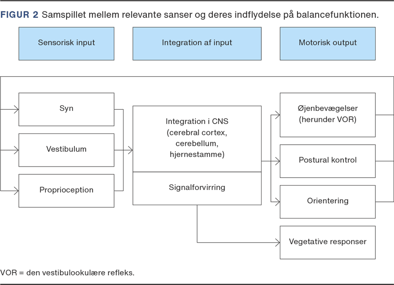 Vestibulær rehabilitering bygger på den centrale bearbejdning af visuelle samt vestibulære og somatosensoriske input. Synet er ofte dominerende og arbejder proaktivt, mens den vestibulære og somatosensoriske sans arbejder reaktivt (Figur 2). Ved svigt af en af sanserne kan de andre kompensere. Ved svigt af flere sanser opstår alvorlige udfordringer.