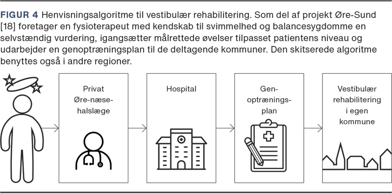 Som del af det Interreg-støttede Projekt Öre-Sund [18] er der tilknyttet specialiserede fysioterapeuter til svimmelhedsambulatoriet i Region Sjælland, som vurderer patienter og udarbejder genoptræningsplaner, før kommunal indsats iværksættes (Figur 4). Projektet styrker samtidig kommunernes viden og kapacitet inden for vestibulær rehabilitering gennem opkvalificering og faglig ensretning.