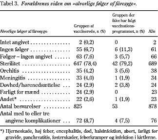 Det, som synes at have betydning for valg eller fravalg af vaccinen, er indstillingen til komplikationer til vaccinen. Det er derfor vigtigt, at man i informationen til forældrene oplyser om de sandsynlige bivirkninger ved vaccinen og holder dem op mod komplikationerne til selve sygdommene. Det, som kan virke overraskende i svarene om bivirkninger ved vaccinen, er, at ca. en fjerdedel i gruppe B angav ændret adfærd (herunder autisme) som bivirkning, hvilket der ikke er videnskabeligt belæg for (6-8), mens motoriske forstyrrelser, som synes sandsynlige, oftest i form af forbigående ataksi (9), kun blev angivet af 6%.