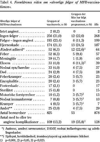 Angående viden om komplikationer til MFR-vaccinationen (Tabel 4) markerer gruppen, der ikke har fulgt programmet, sig ved, at signifikant flere har angivet to eller tre komplikationer til vaccinationen. Ændret adfærd, hvilket inkluderer autisme, blev angivet af flere i gruppe B end i gruppe A. Det blev angivet af 23% i gruppe B.