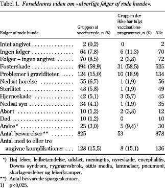 Med hensyn til røde hunde synes der at være en generel viden om, at sygdommen under graviditet kan skade fostret (60%), medtager man i denne gruppe også besvarelserne »problemer i graviditeten«, giver det 75%, hvilket dog stadig er lavere end i en tidligere dansk undersøgelse blandt forældre, der havde afstået fra MFR-vaccination (96%) (1). Dette kan skyldes, at spørgsmålene var åbne i denne undersøgelse, hvorimod der i undersøgelsen fra 1991 var opstillet nogle valgmuligheder. Desuden foregik der i de første år af vaccinationsprogrammet en større oplysningskampagne i radio og tv.