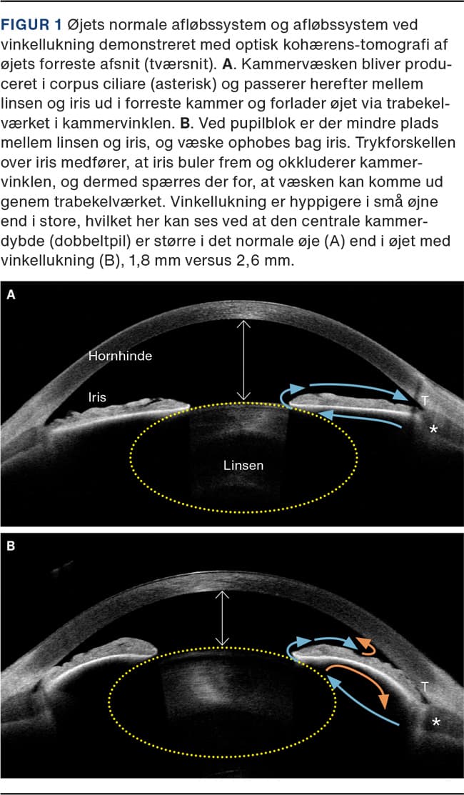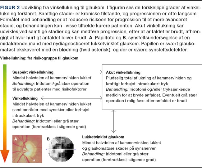 I denne artikel fokuseres der på vinkellukning og lukketvinklet glaukom, da vores viden om disse tilstande er øget væsentligt i de seneste 20 år. Det Europæiske Glaukom Selskab har i 2021 publiceret nye guidelines, og de danske diagnoser i sygehusvæsenets klassifikationssystem er blevet opdateret pr. 1. januar 2021. Det er således et passende tidspunkt at opdatere læger her i landet om emnet.
