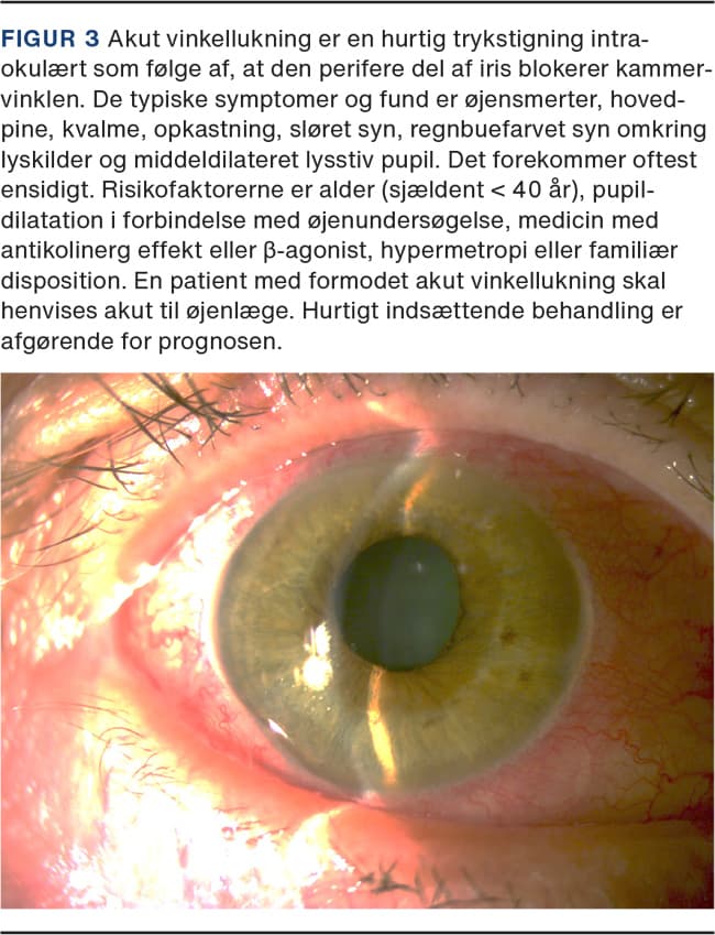 Ved akut vinkellukning (Figur 3) får lægen oftest mistanken ved anamnesen. Objektivt finder man en lysstiv middeldilateret pupil, og hornhinden kan fremstå mat pga. ødem. Disse patienter skal henvises akut til en øjenlæge eller til en øjenafdeling. Lukketvinklet glaukom kræver diagnostisk udredning af en øjenlæge, da tilstanden oftest er asymptomatisk. Øjenlægen finder typisk forhøjet intraokulært tryk (> 21 mmHg). Det er vigtigt, at man supplerer med en gonioskopisk undersøgelse, som diagnostisk er guldstandard [16]. Ved gonioskopi placerer man et kontaktglas med et skråspejl på hornhinden, hvorved man kan se, at kammervinklen er helt eller delvist lukket. Computerstyret perimetri bruges til undersøgelse for synsfeltsdefekter, som vil opstå ved længerevarende højt intraokulært tryk.